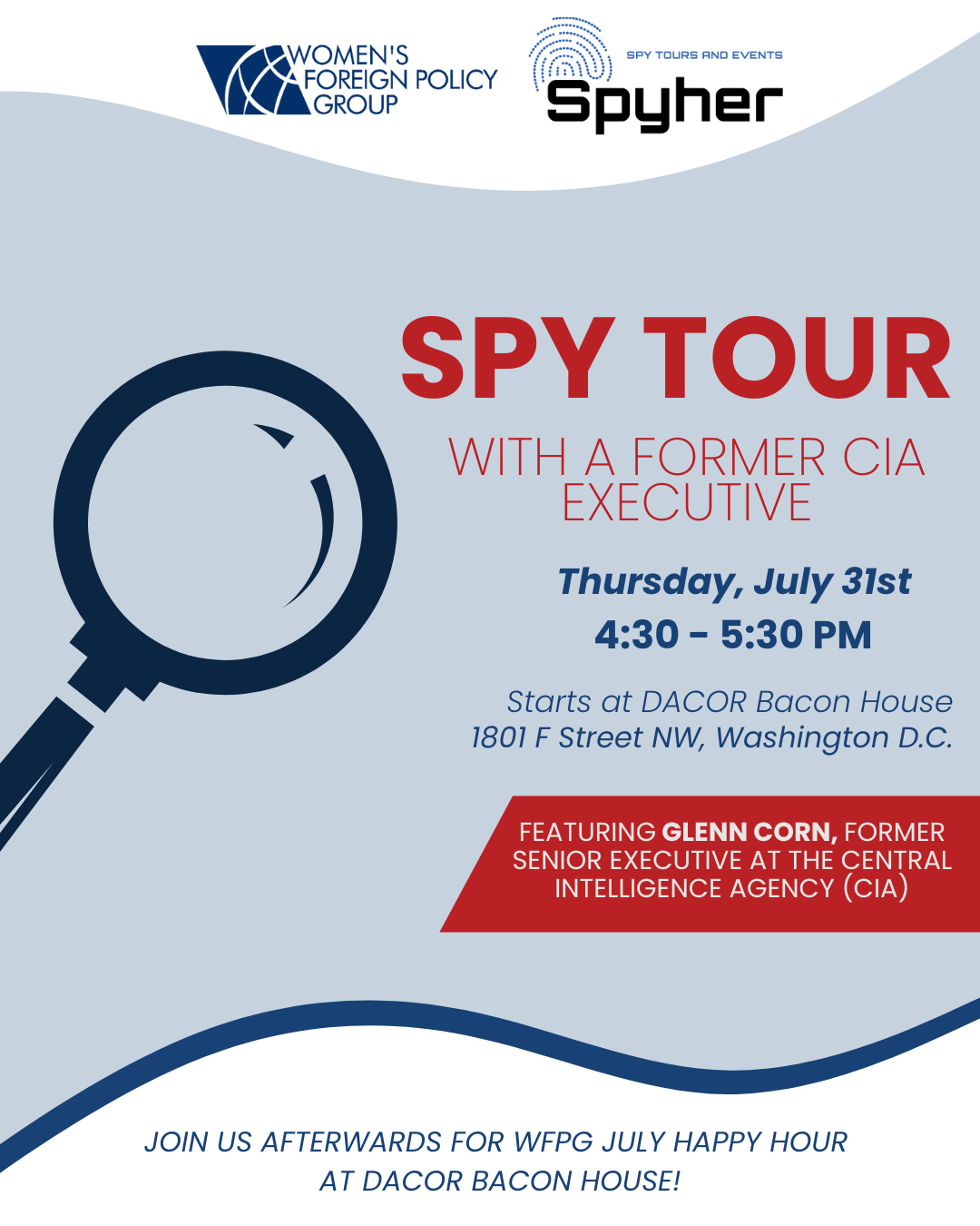 Step into the shadowy world of espionage in DC with Spyher on Thursday, July 31st at 4:30 PM, for an exclusive 1-hour walking tour led byled by former Senior Executive at the Central Intelligence Agency (CIA), Glenn Corn. Explore select 'spy-sites' and hear about Russian Intelligence Modus Operandi (M.O.) from a subject matter expert! The tour, curated exclusively for WFPG members, will conclude at WFPG's July Happy Hour at DACOR Bacon House— the perfect setting to continue conversation. |