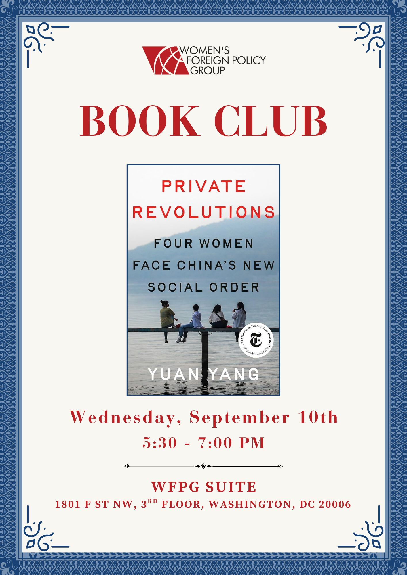 Please join the Women's Foreign Policy Group for our next Book Club taking place on Wednesday, September 10th: Private Revolutions: Four Women Face China’s New Social Order by Yuan Yang. Yuan Yang is a British Member of Parliament and a former Financial Times China correspondent. This 2024 release paints a sweeping yet intimate portrait of modern China through the lives of four ordinary women striving for a better future. |