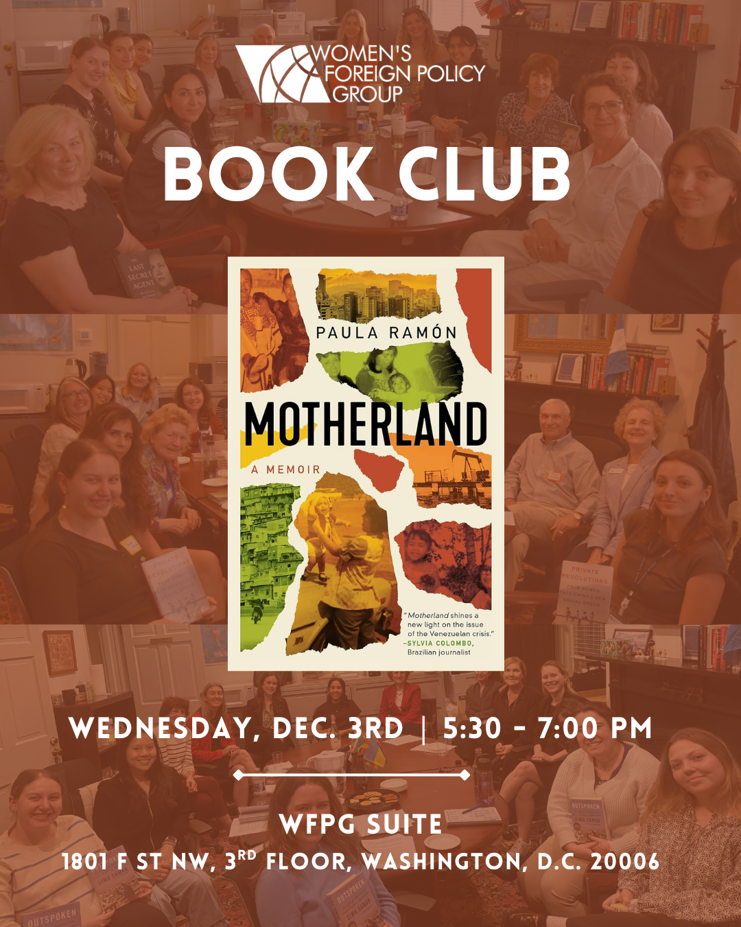 Please join the Women's Foreign Policy Group on Wednesday, December 3rd, from 5:30 – 7:00 PM for the next session of our WFPG Book Club! We’ll delve into Motherland: A Memoir by Paula Ramón, an accomplished Venezuelan journalist, featured in publications including The New York Times and National Geographic. Ramón's book tells the story of her relationship with her family against the backdrop of economic collapse in her home country. Her highly personal story provides a glimpse into life in Venezuela throughout the rise and fall of the rule of Hugo Chávez.