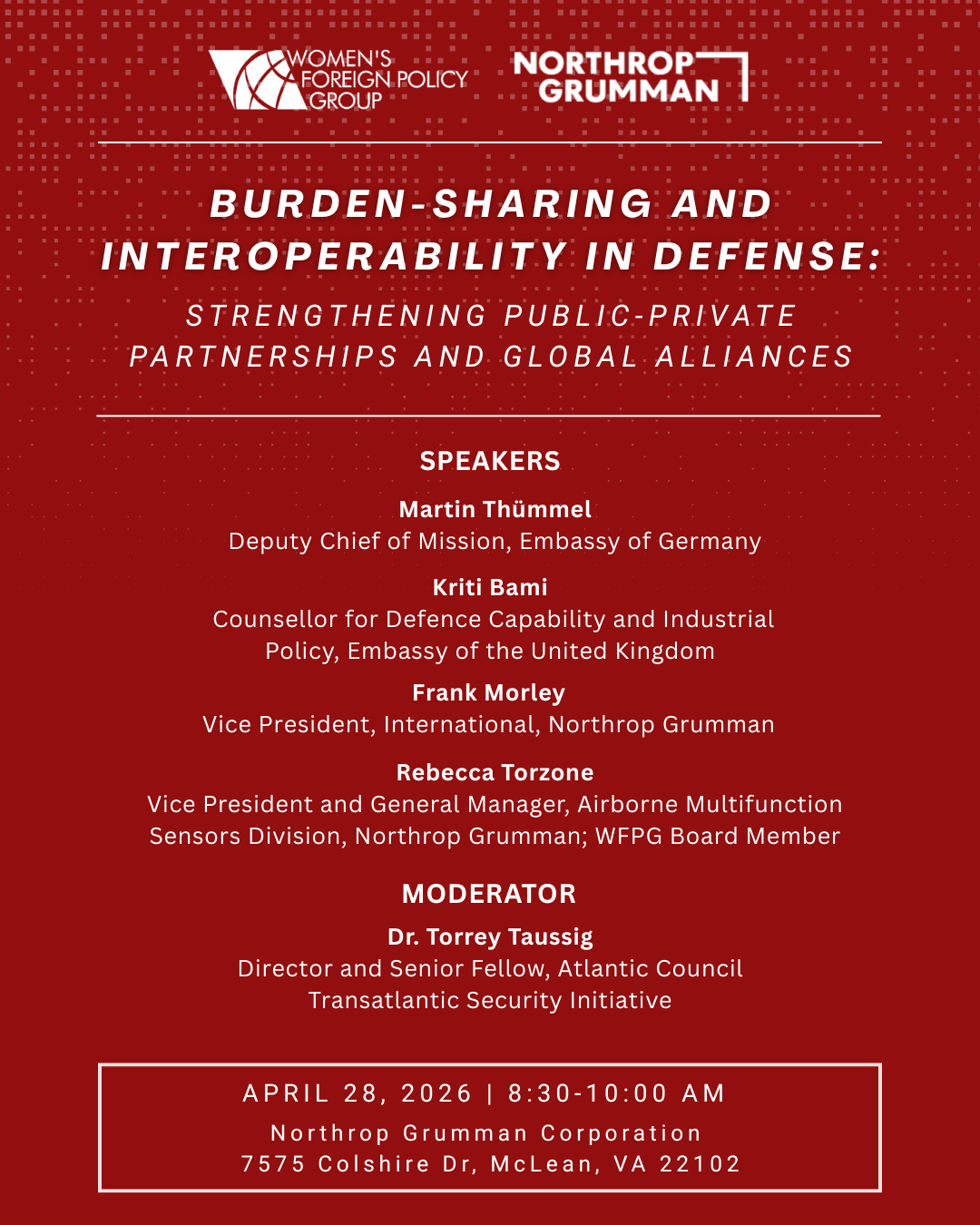 Join the Women's Foreign Policy Group and Northrop Grumman for "Burden-Sharing and Interoperability in Defense: Strengthening Public-Private Partnerships and Global Alliances," on Tuesday, April 28th, from 8:30 - 10:00 AM ET. This discussion will bring together U.S. and European government leaders and industry experts to examine evolving government–industry dynamics in defense cooperation, interoperability, and commercial innovation. Our esteemed panelists include H.E. Martin Thümmel, Deputy Head of Mission, Embassy of Germany; Kriti Bami, Counsellor for Defence Capability and Industrial Policy, Embassy of the United Kingdom; Frank Morley,Vice President, International, Northrop Grumman; and Rebecca Torzone, Vice President and General Manager, Airborne Multifunction Sensors Division, Northrop Grumman & WFPG Board Member. The conversation will be moderated by Dr. Torrey Taussig, Director and Senior Fellow, Atlantic Council Transatlantic Security Initiative.